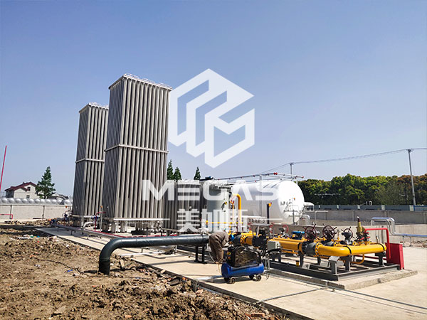 LNG由槽車運(yùn)至氣化站,利用LNG卸車增壓器使槽車內(nèi)壓力增高,將槽車內(nèi)LNG送至LNG低溫儲(chǔ)罐內(nèi)儲(chǔ)存。當(dāng)從LNG儲(chǔ)罐外排時(shí),先通過儲(chǔ)罐的自增壓系統(tǒng),使儲(chǔ)罐壓力升高,然后打開儲(chǔ)罐液相出口閥,通過壓力差將儲(chǔ)罐內(nèi)的LNG送至氣化器后,經(jīng)調(diào)壓、計(jì)量、加臭等工序送入市政燃?xì)夤芫W(wǎng)。當(dāng)室外環(huán)境溫度較低,空溫式氣化器出口的天然氣溫度低于5℃時(shí),需在空溫式氣化器出口串聯(lián)水浴式加熱器,對(duì)氣化后的天然氣進(jìn)行加熱。